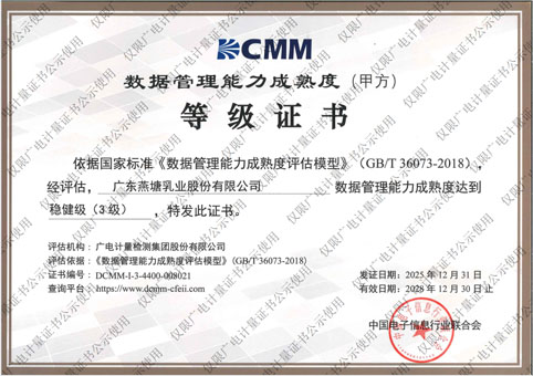 日前,,,,兴尔盛乳业正式通过中国电子信息行业联合会评审,,,荣获国家数据管理能力成熟度(DCMM)认证,,,评估等级达到稳健级(三级),,标志着公司实现数据全生命周期规范化、、、、标准化、、、、智能化管控,,,在数据资产化管理与价值挖掘方面迈进行业前列。。
